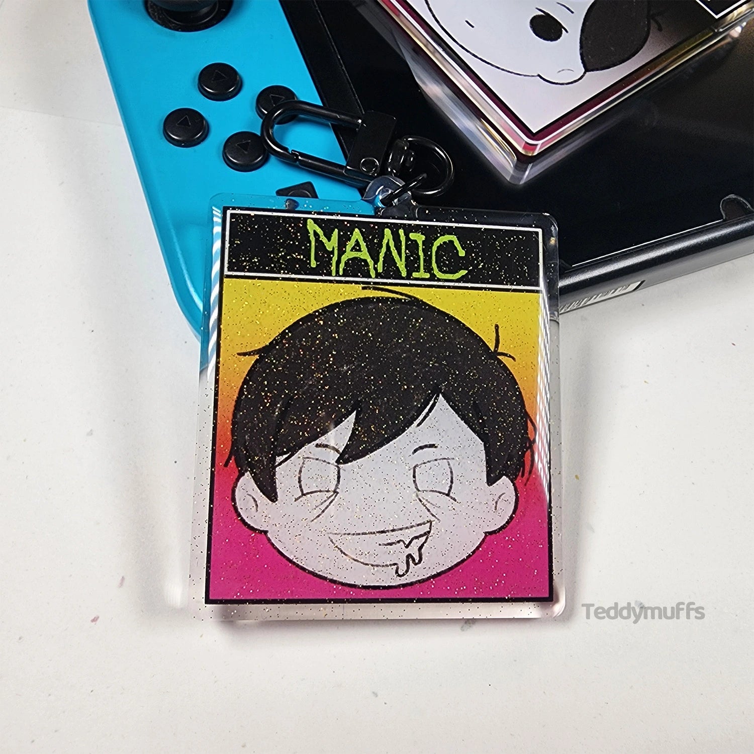This clear acrylic keychain features artwork inspired by Omori, showcasing both manic and neutral expressions with different artwork on each side. A glitter resin dome adds a subtle sparkle while keeping the charm smooth, vibrant, and eye-catching on bags or keys.