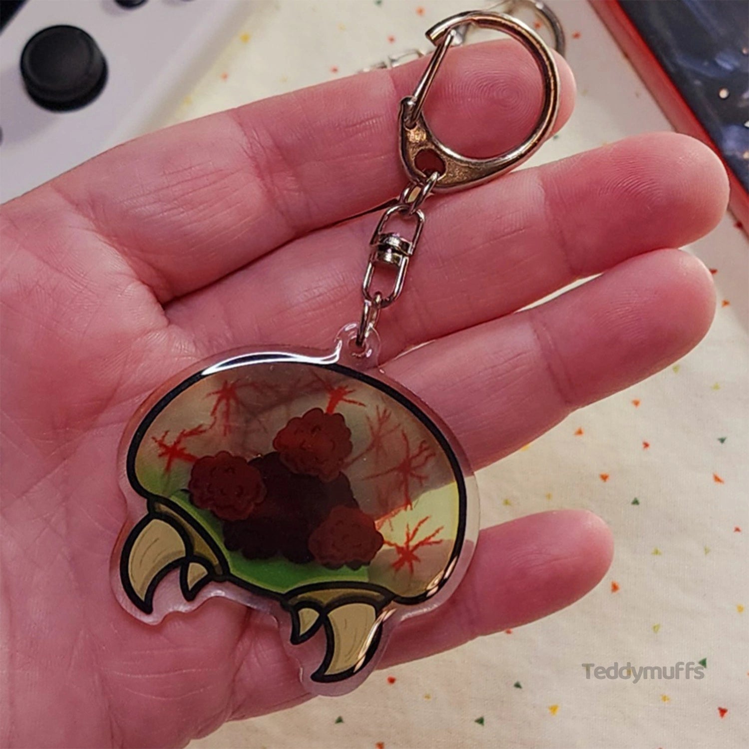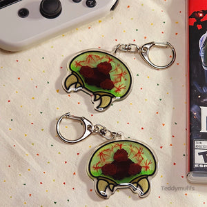 This clear acrylic keychain features a Metroid alien design inspired by Metroid, printed on both sides for a bold, high-contrast look. Finished with a smooth resin dome and classic silver hardware, it’s a striking addition to bags, backpacks, or keys.