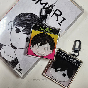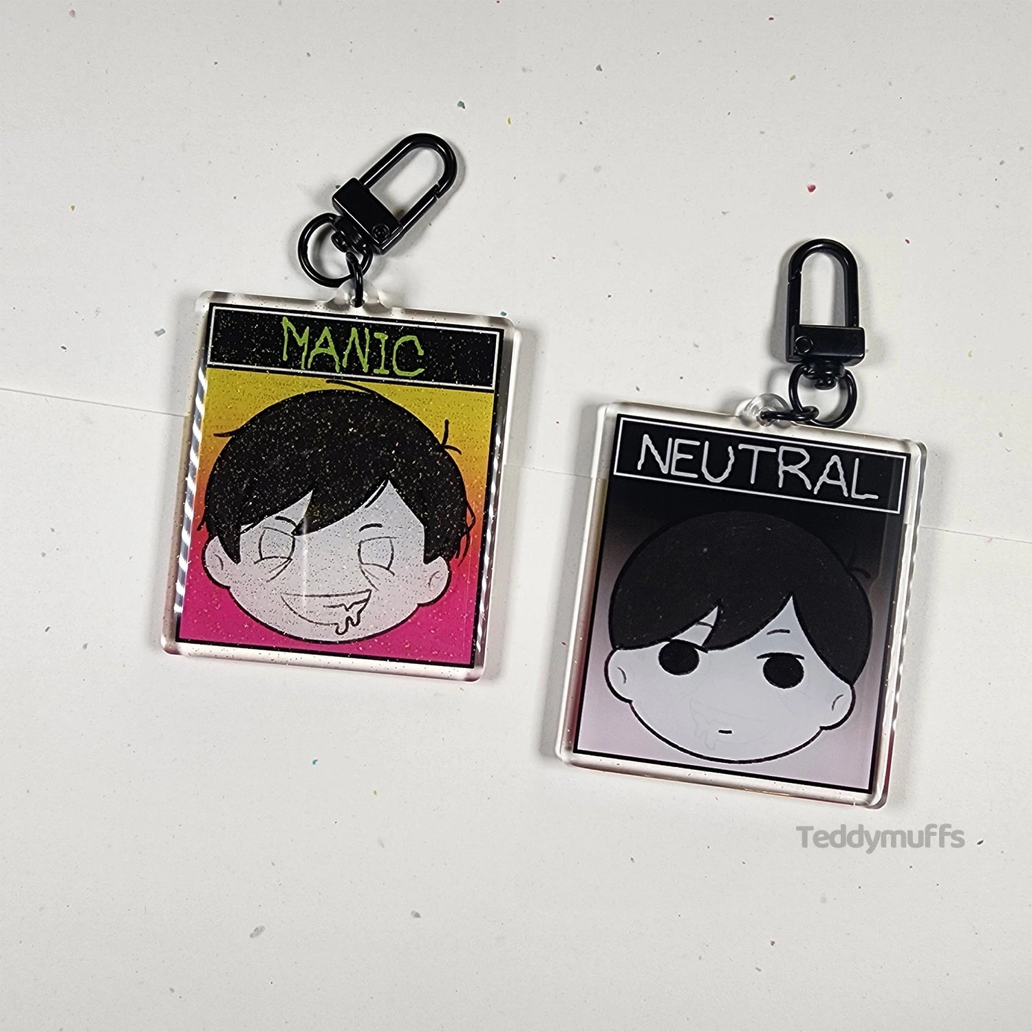 This clear acrylic keychain features artwork inspired by Omori, showcasing both manic and neutral expressions with different artwork on each side. A glitter resin dome adds a subtle sparkle while keeping the charm smooth, vibrant, and eye-catching on bags or keys.