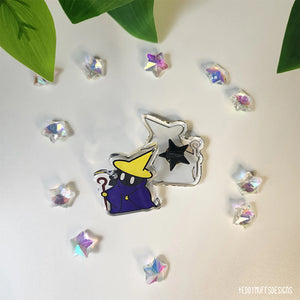 Add a touch of classic JRPG magic to your accessories with this Black Mage acrylic pin. Featuring a cute chibi-style design inspired by iconic retro role-playing games, this pin is perfect for fans of old-school fantasy and pixel-era vibes.